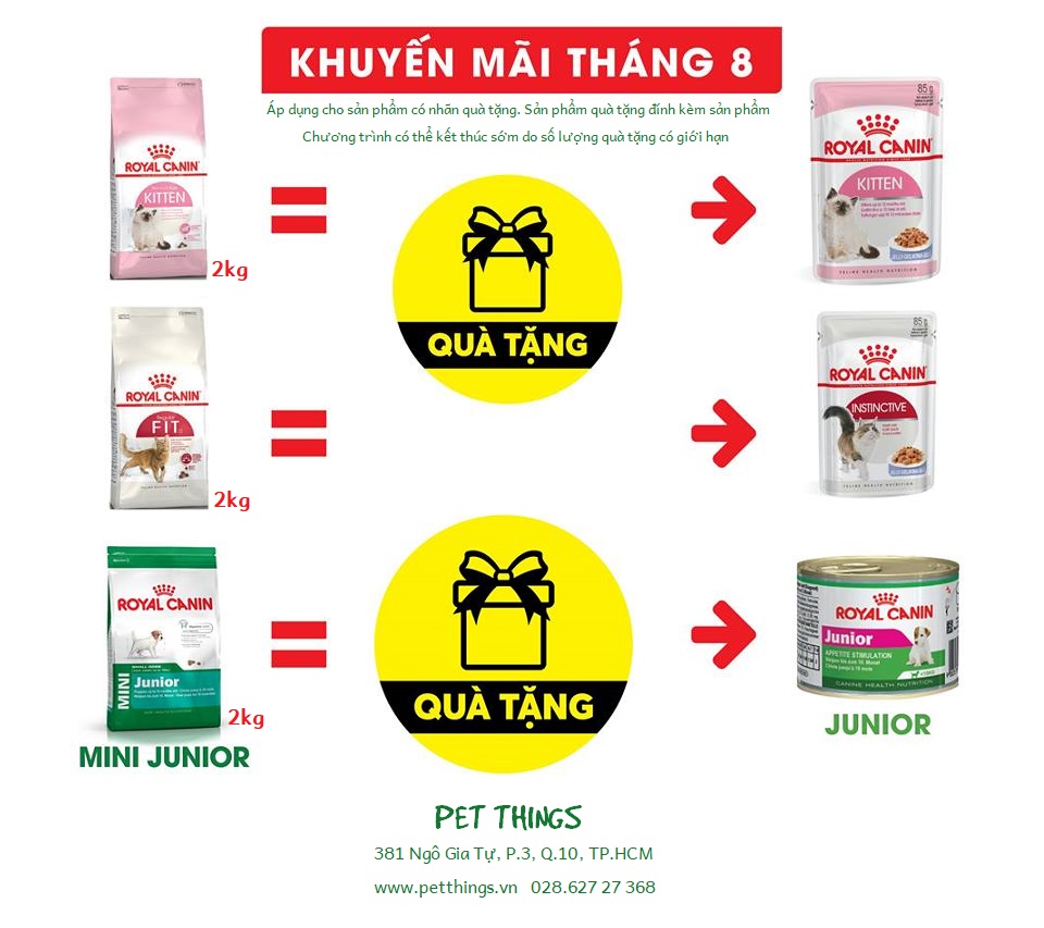 - Khi mua 1 bao Royal Canin Mini Junior 2kg có nhãn QUÀ TẶNG + sản phẩm tặng đính kèm là 1 lon pate 195g Royal Canin Junior
