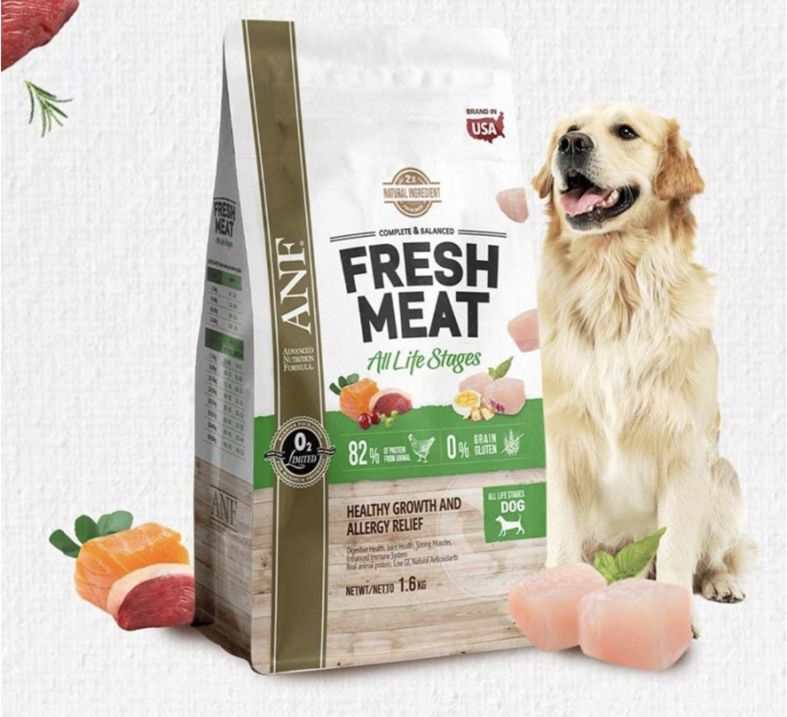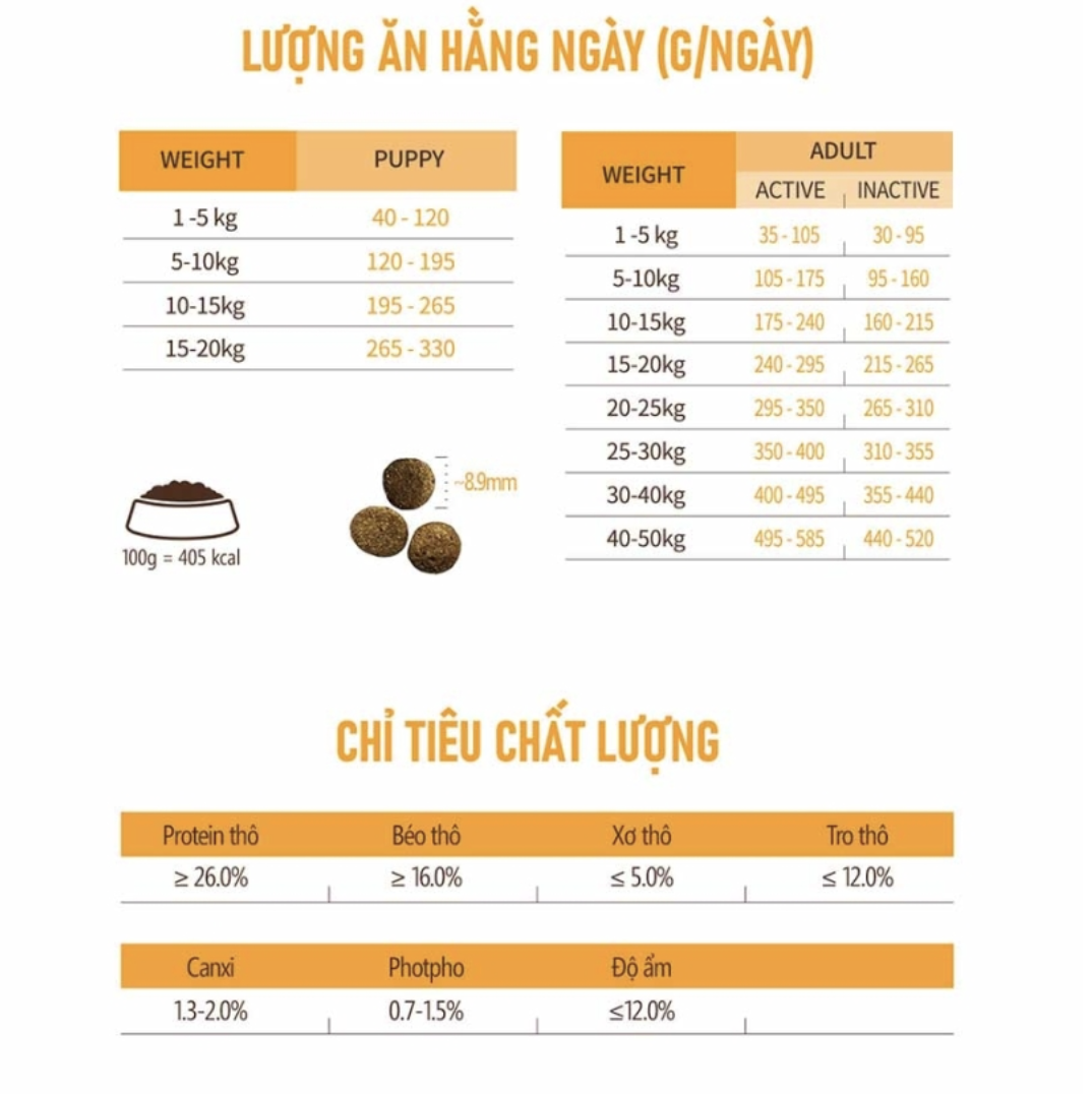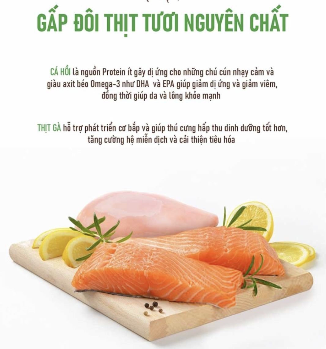 Protein động vật ( thịt gà tươi đã tách xương, Bột thịt gà, bột cá, cá hồi thủy phân), dầu gà, khoai lang, đậu Hà Lan, Đậu gà, bột chuối, đậu faba, Bột trứng, Đậu lăng, bã củ cải đường, Beta-carotene, Probiotics (Bacillus subtilis, Bacillus licheniformis, Asprtgillus oryzae, Lactobacillus acidophilus, Streptococcus thermophilus, Saccha-romyces cerevisiae), Curcumin, Axit butyric, Glucosamin, Chondroitin, Chitosan, L-camitine, Chiết xuất thảo mộc (Angelica sinensism Angelica genuflexa Nutt, White woodland peony , Rehmannia glutinosan), Men bia khô, Hạt lanh, DL- methionine, taurine, Vitamin premix, (VitaminA, VitaminB1, VitaminB2, VitaminB3, VitaminB5, VitaminB6, Vitamin B12, VitaminC, Vitamin D3, Vitamin E, Axit folic, Biotin), Chất chống oxy hóa tự nhiên (Chất xuất hương thảo, vitamin E, Axit xitric, Flavonoid) Hợn hợp khoáng chất (Sắt, kẽm , mangan, đồng, Iốt, Coban, Selen), Khoáng chất chelate ( Mangan, sắt, kẽm, đồng, coban, Iốt, selen) Chiết xuất cỏ cà ri, Hỗn hợp quả mọng (quả Maqui, Quả Acai, Aronia), protease (Enzyme), Chiết xuất Yucca. Kali clorua