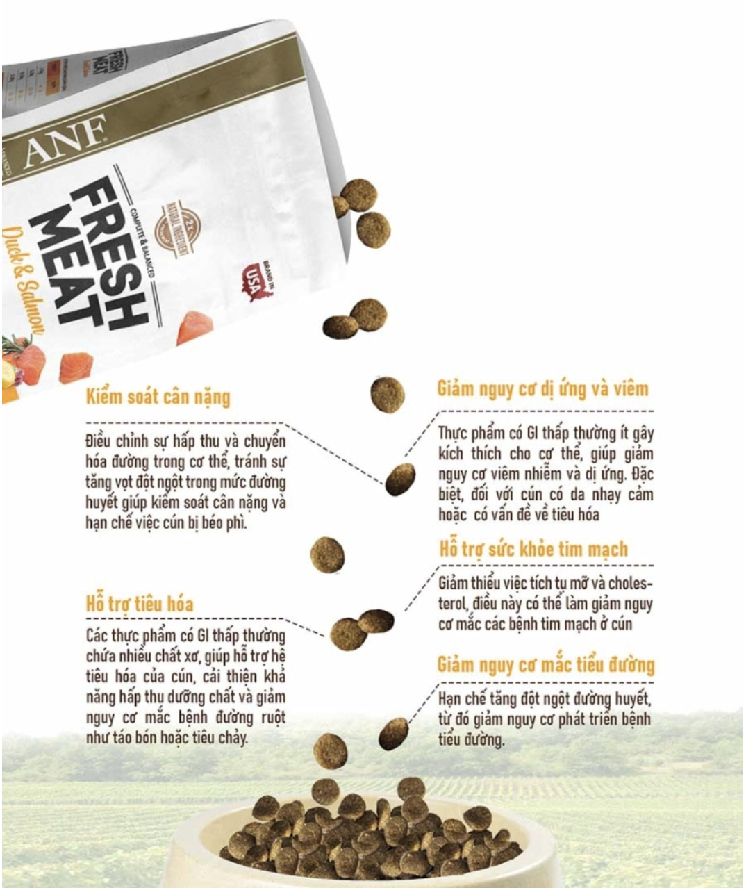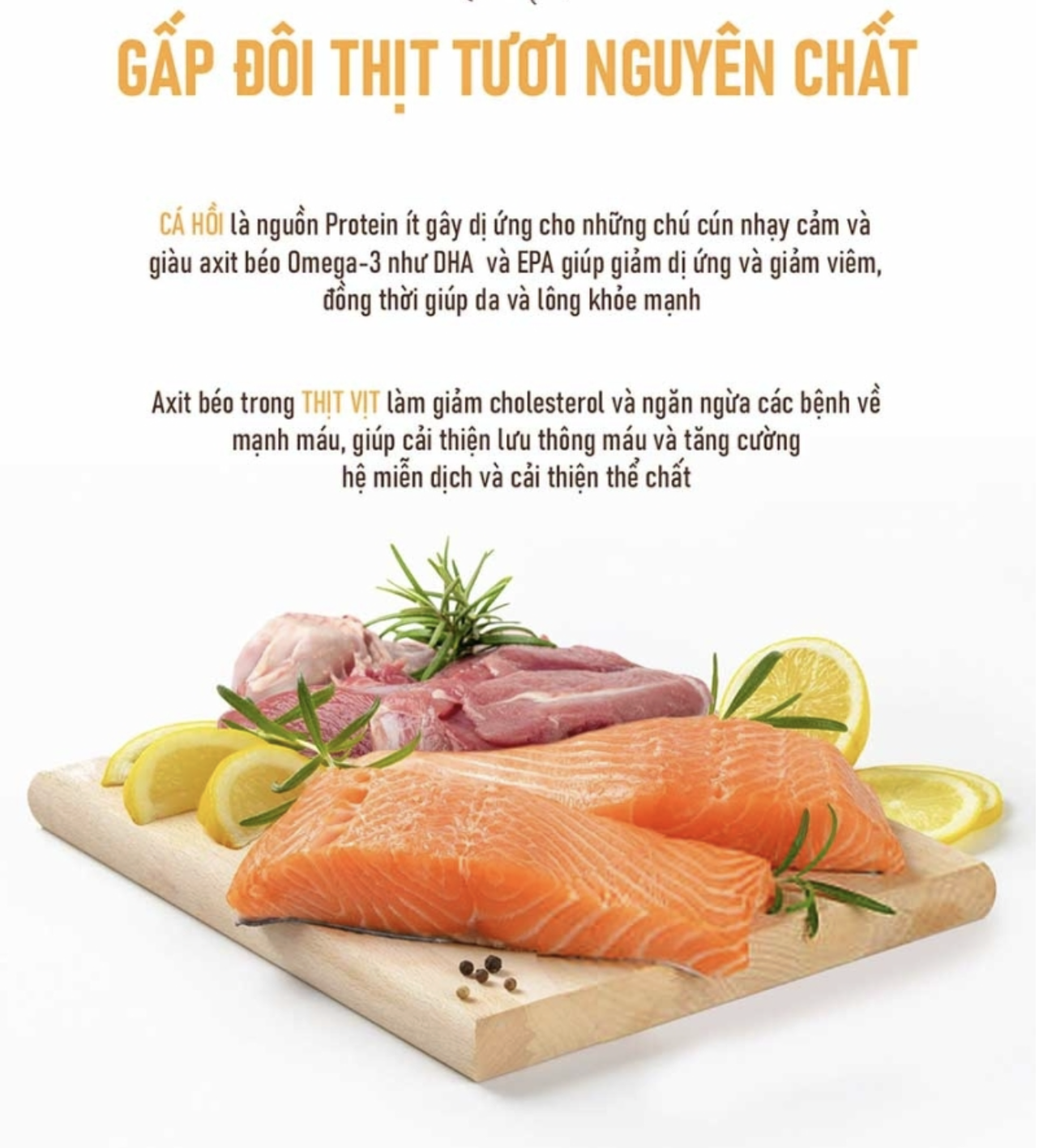 Protein động vật ( thịt vịt tươi đã tách xương, Bột thịt vịt, bột cá, cá hồi thủy phân), Bột thịt vịt thủy phân (Hương vị tự nhiên), dầu gà, khoai lang, đậu Hà Lan, Đậu gà, bột chuối, đậu faba, Bột trứng, Đậu lăng, bã củ cải đường, Beta-carotene, Probiotics (Bacillus subtilis, Bacillus licheniformis, Asprtgillus oryzae, Lactobacillus acidophilus, Streptococcus thermophilus, Saccha-romyces cerevisiae), Curcumin, Axit butyric, Glucosamin, Chondroitin, Chitosan, L-camitine, Chiết xuất thảo mộc (Angelica sinensism Angelica genuflexa Nutt, White woodland peony , Rehmannia glutinosan), Men bia khô, Hạt lanh, DL- methionine, taurine, Vitamin premix, (VitaminA, VitaminB1, VitaminB2, VitaminB3, VitaminB5, VitaminB6, Vitamin B12, VitaminC, Vitamin D3, Vitamin E, Axit folic, Biotin), Chất chống oxy hóa tự nhiên (Chất xuất hương thảo, vitamin E, Axit xitric, Flavonoid) Hợn hợp khoáng chất (Sắt, kẽm , mangan, đồng, Iốt, Coban, Selen), Khoáng chất chelate ( Mangan, sắt, kẽm, đồng, coban, Iốt, selen) Chiết xuất cỏ cà ri, Hỗn hợp quả mọng (quả Maqui, Quả Acai, Aronia), protease (Enzyme), Chiết xuất Yucca. Kali clorua