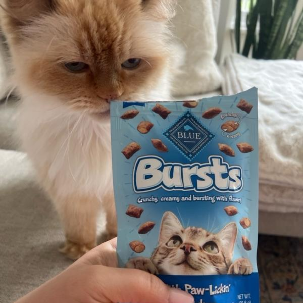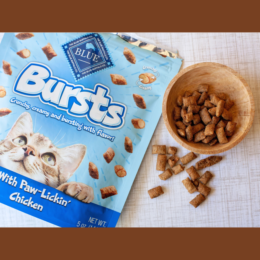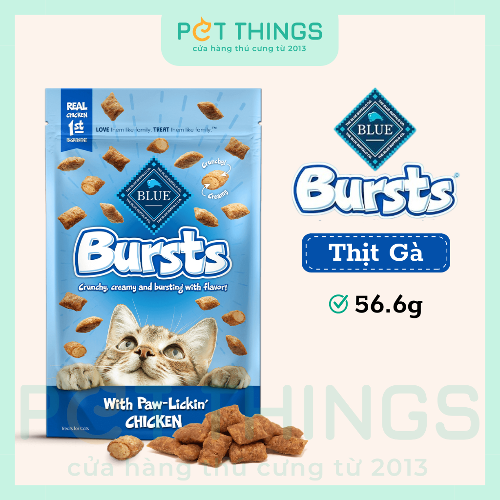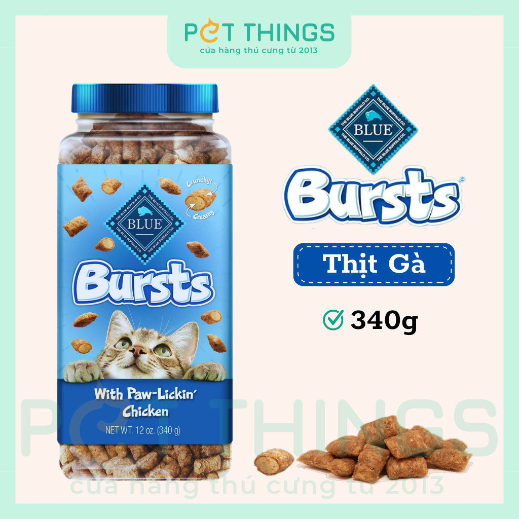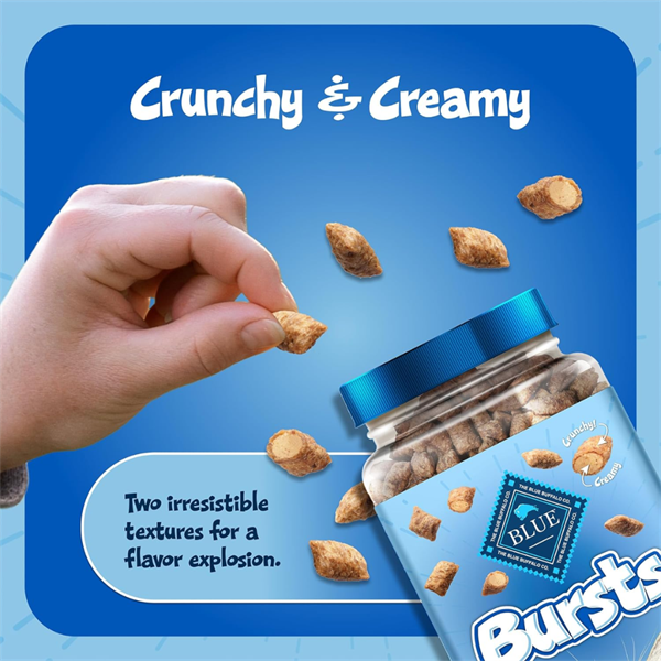 Bánh thưởng Blue Buffalo Bursts là một sự bùng nổ về hương vị và kết cấu, với lớp vỏ ngoài giòn tan cùng phần kem béo ngậy ở giữa. Sản phẩm được làm từ thịt thật cùng các thành phần tự nhiên, không chứa các sản phẩm phụ từ động vật, ngô, lúa mì và đậu nành. Bánh thưởng Blue Buffalo Bursts là món ăn vặt lành mạnh, bổ dưỡng, chứa đầy đủ chất dinh dưỡng mà mèo cần.