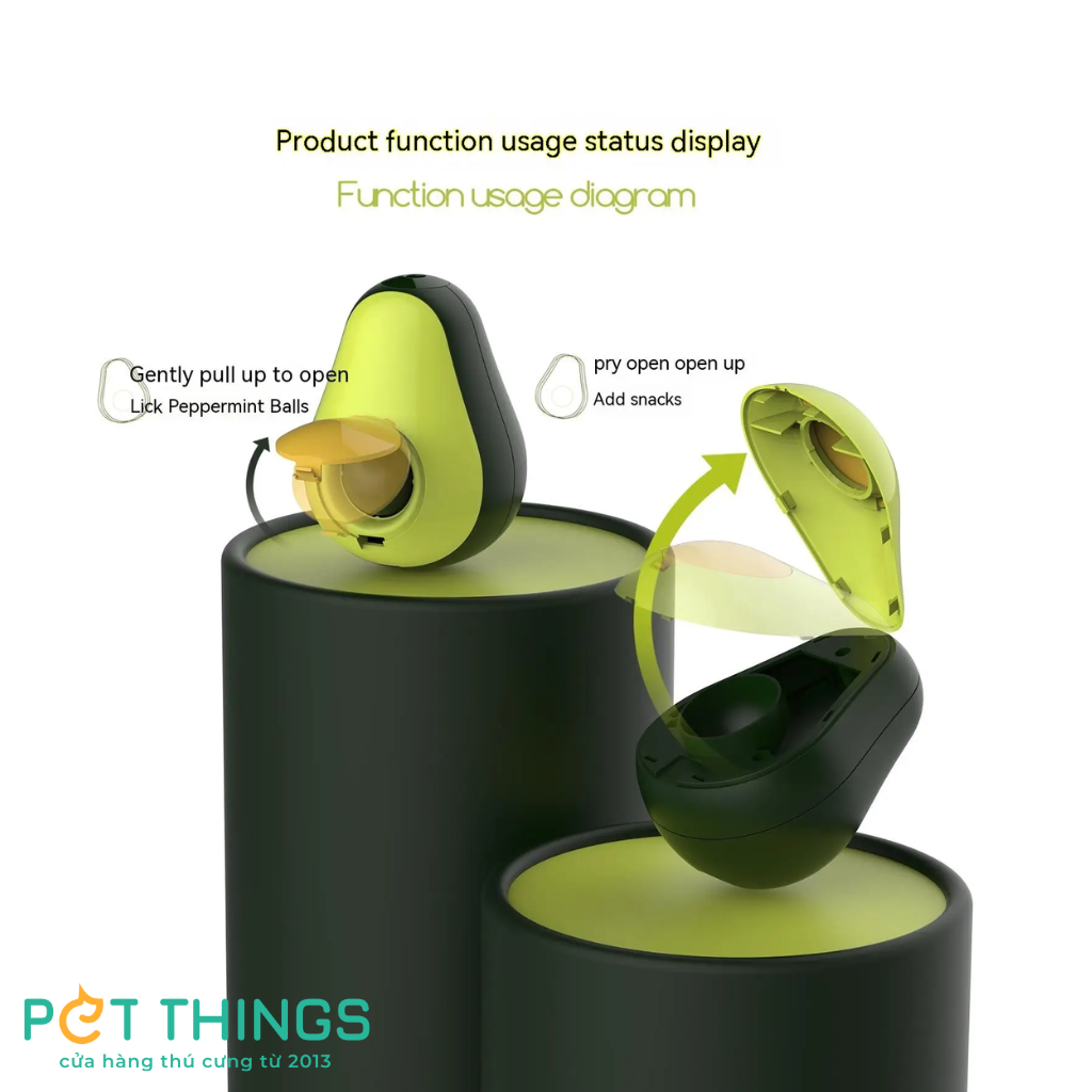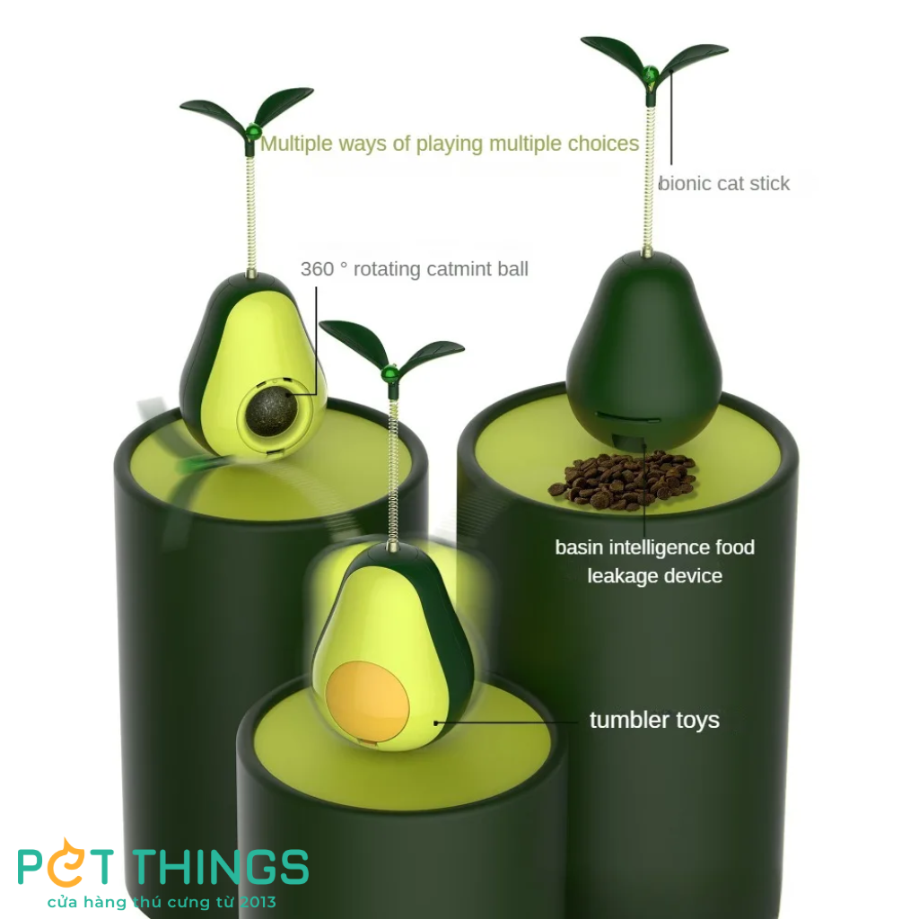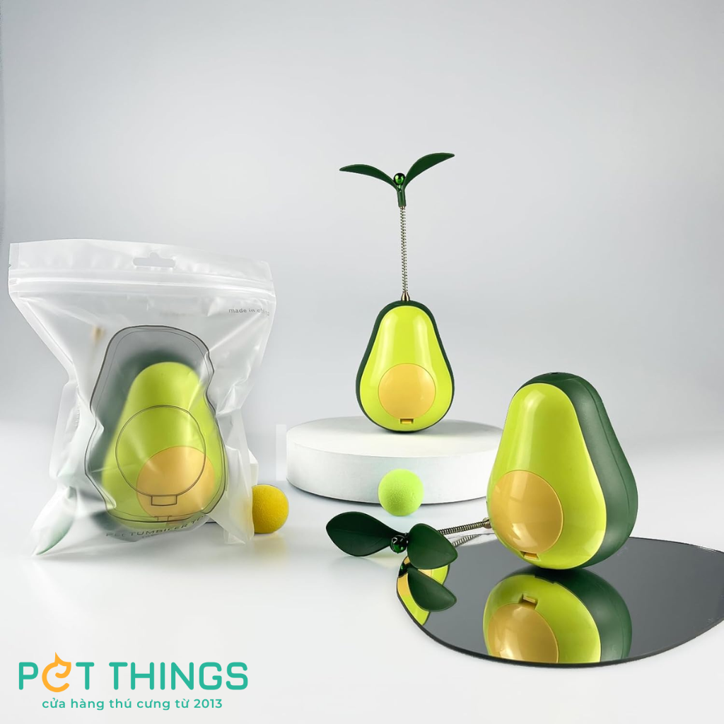 1. Lật đật hình quả bơ: Lấy cảm hứng từ quả bơ, món đồ chơi này có thiết kế lắc lư kết hợp với ngăn đựng rò rỉ thức ăn. Ngăn đựng có thể sử dụng được với hầu hết các loại thực phẩm và đồ ăn nhẹ. Sản phẩm sẽ giúp khuyến khích mèo ăn uống chậm hơn. Thiết kế độc đáo của sản phẩm yêu cầu mèo phải liên tục lắc và lăn đồ chơi để tiếp cận thức ăn, giúp tăng cường trí thông minh và khả năng thể chất của mèo