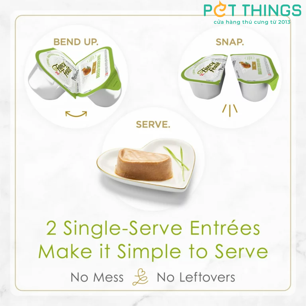 Hãy làm hài lòng chú mèo khó tính của bạn với Fancy Feast Petites - thức ăn ướt dành cho mèo sành ăn. Sản phẩm được làm từ thịt thật, không chứa chất bảo quản và màu nhân tạo. Mỗi hộp được chia thành hai ngăn, khẩu phần hoàn hảo cho một lần ăn để tránh gây lãng phí thừa mứa.