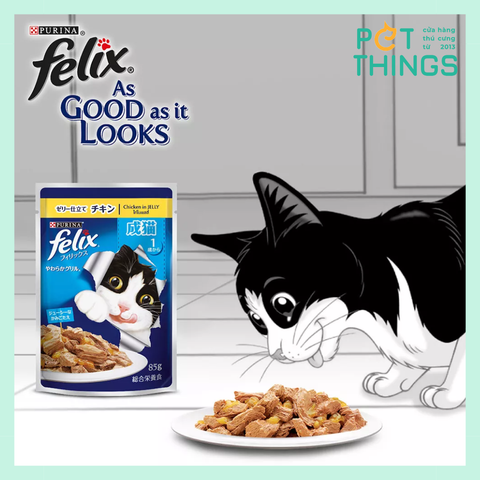 Thức ăn cho mèo Felix được tuyển chọn từ những nguyên liệu tốt nhất với những miếng thịt mềm cắt miếng nhỏ vừa ăn cùng lớp thạch mọng nước dậy mùi, cho kết cấu và hương vị hấp dẫn như một món ăn nấu tại nhà bạn!