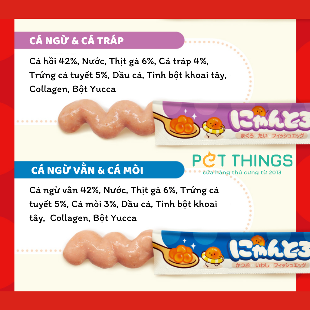 *CÁ NGỪ & THANH CUA: Cá ngừ 42%, Nước, Thịt gà 6%, Trứng cá tuyết 5%, Thanh cua 3%, Dầu cá, Tinh bột khoai tây, Collagen, Bột Yucca