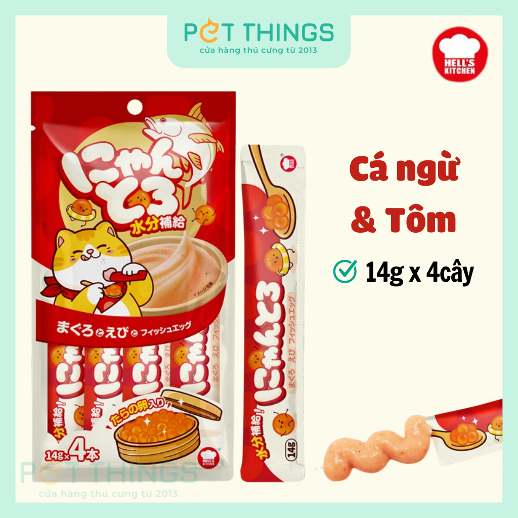 *CÁ NGỪ & TÔM: Cá ngừ 42%, Nước, Thịt gà 6%, Tôm 4%, Trứng cá tuyết 5%, Dầu cá, Tinh bột khoai tây, Collagen, Bột Yucca