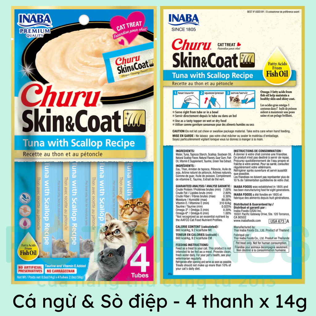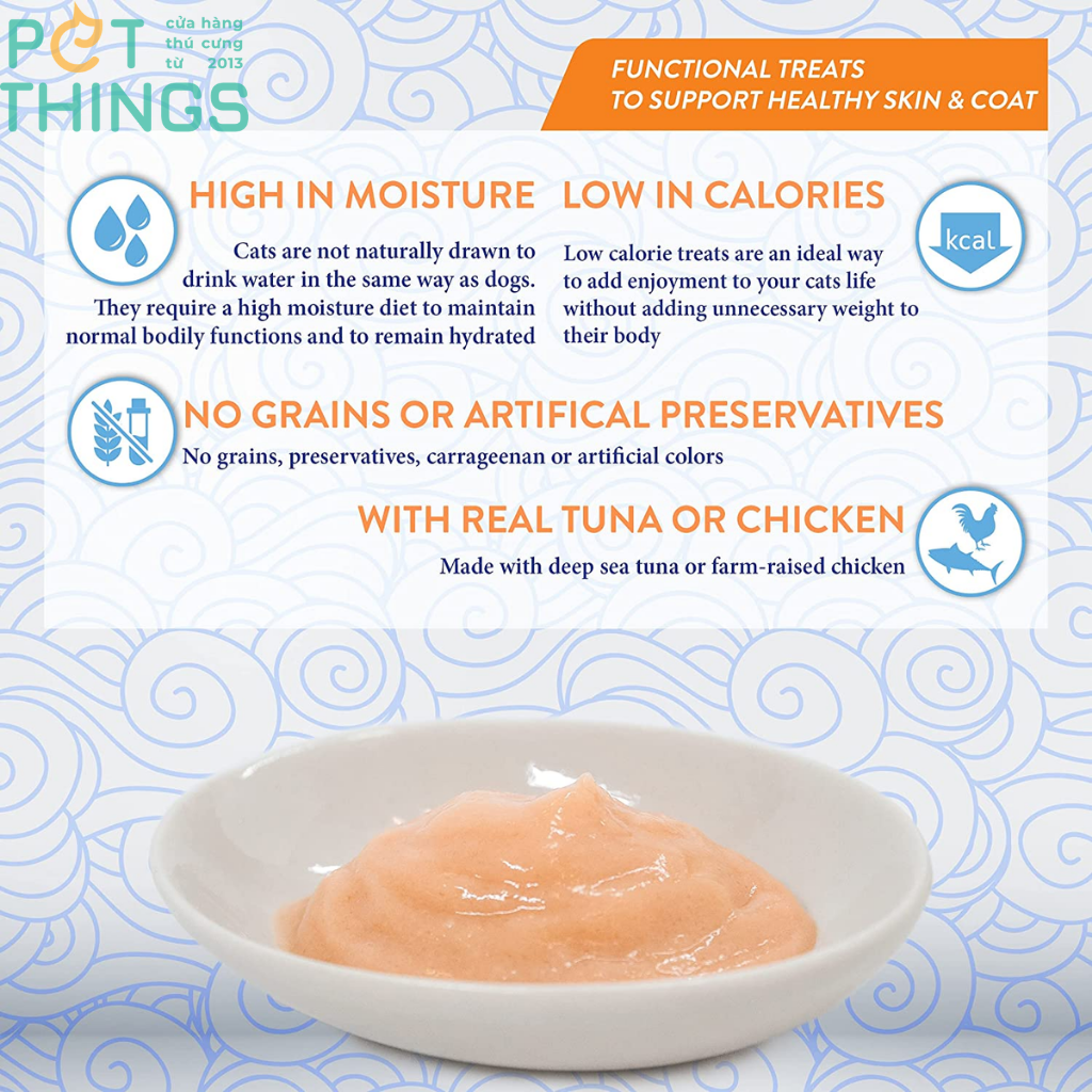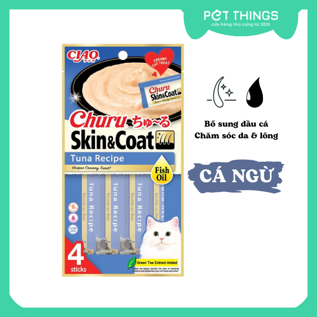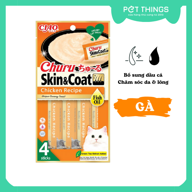 Súp thưởng Churu Skin & Coat là món ăn nhẹ dinh dưỡng lành mạnh, ít calo, bổ sung dầu cá giúp chăm sóc sức khỏe của da lông