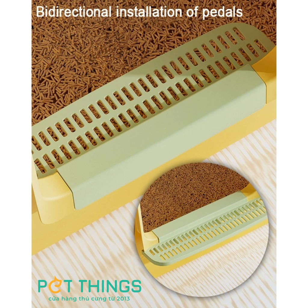 Thiết kế 2 cửa độc đáo: mèo có thể vào qua cửa phía trước và nhảy ra ở phía trên. Các rãnh trên nắp giúp hứng các hạt cát bám ở chân mèo, ngăn không cho cát làm bẩn sàn nhà