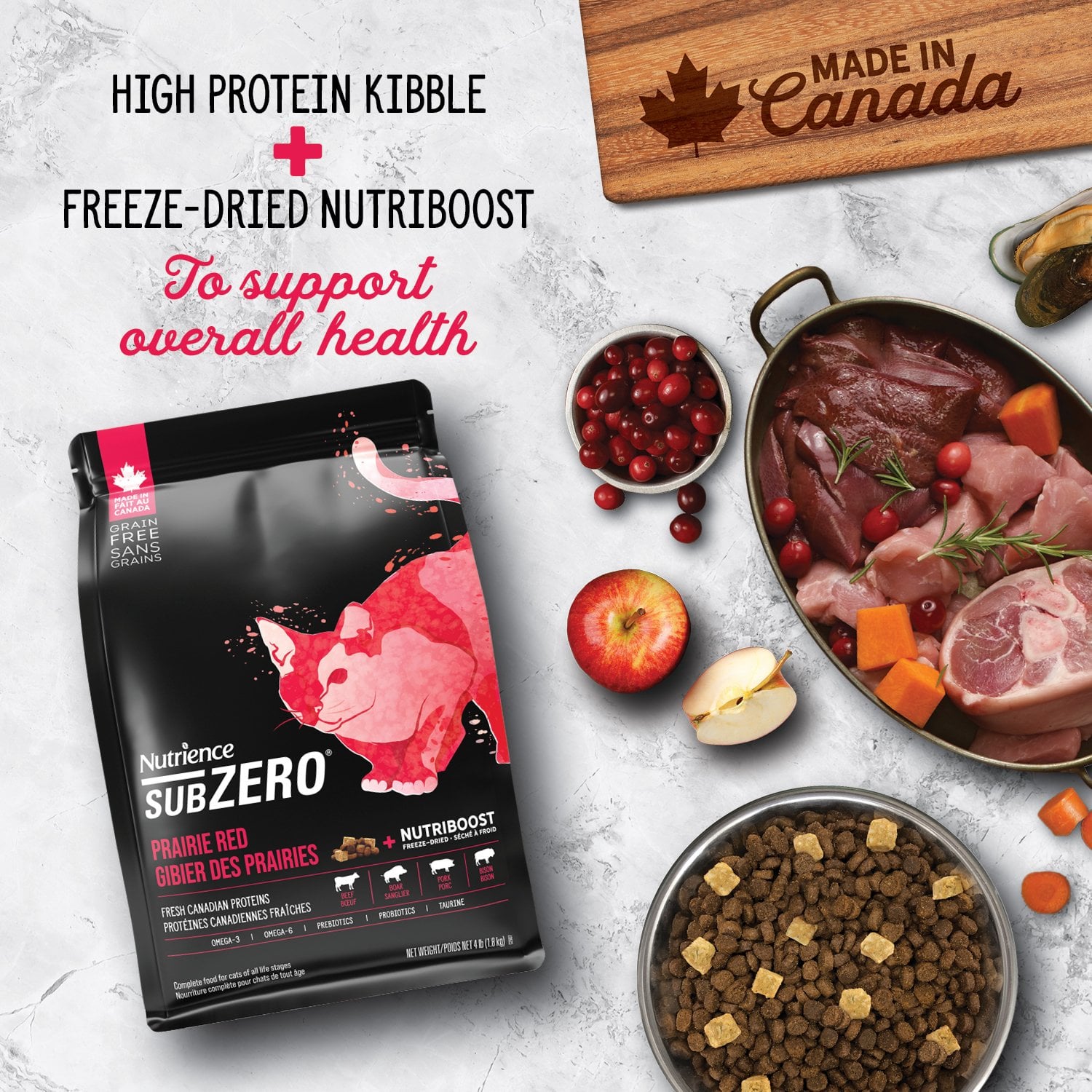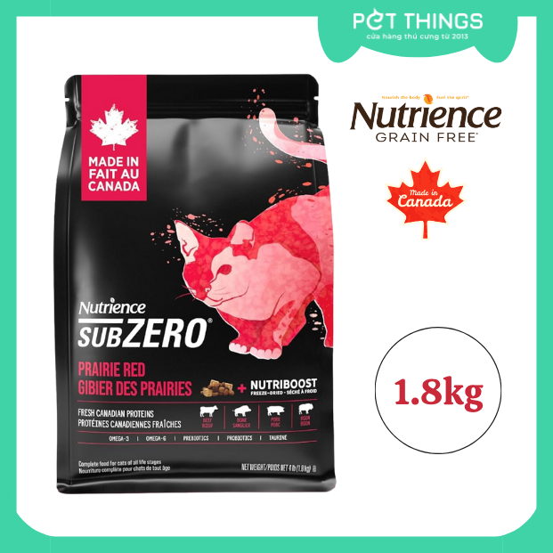 Nutrience SubZero Prairie Red được thiết kế để đáp ứng mức dinh dưỡng theo Hồ sơ dinh dưỡng thức ăn cho mèo của AAFCO cho mọi giai đoạn sống.