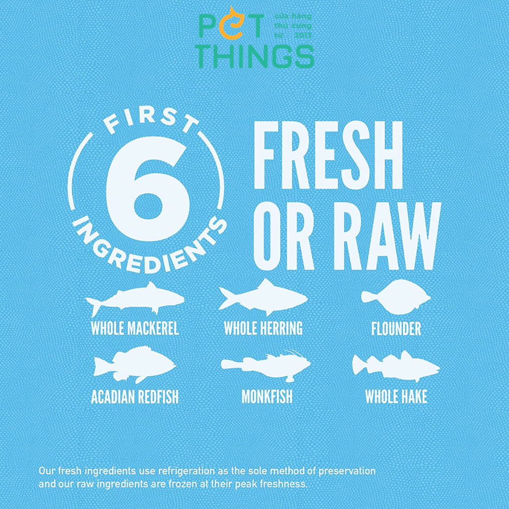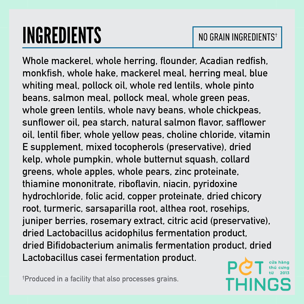 Cá thu nguyên con, cá trích nguyên con, cá bơn, cá đỏ Acadian, cá tuế, cá heke nguyên con, bột cá thu, bột cá trích, bột cá trắng xanh, dầu cá minh thái, đậu lăng đỏ nguyên hạt, đậu pinto nguyên hạt, bột cá hồi, bột cá minh thái, đậu xanh nguyên hạt, đậu lăng xanh nguyên hạt , đậu xanh nguyên hạt, đậu xanh nguyên hạt, dầu hướng dương, tinh bột đậu, hương cá hồi tự nhiên, dầu cá la hán, xơ đậu lăng, đậu Hà Lan vàng nguyên hạt, choline chloride, bổ sung vitamin E, hỗn hợp tocopherols (chất bảo quản), tảo bẹ khô, bí ngô nguyên hạt, hạt bơ nguyên hạt bí, rau xanh, táo, toàn bộ quả lê, kẽm proteinat, thiamine mononitrate, riboflavin, niacin, pyridoxine hydrochloride, axit folic, proteinat đồng, rễ rau diếp xoăn khô, nghệ, rễ sarsaparilla, rễ cây alt, hoa hồng, quả bách xù, chiết xuất cây hương thảo, axit citric (chất bảo quản), sản phẩm lên men Lactobacillus acidophilus khô,sản phẩm lên men Bifidobacterium animalis khô, sản phẩm lên men Lactobacillus casei khô.