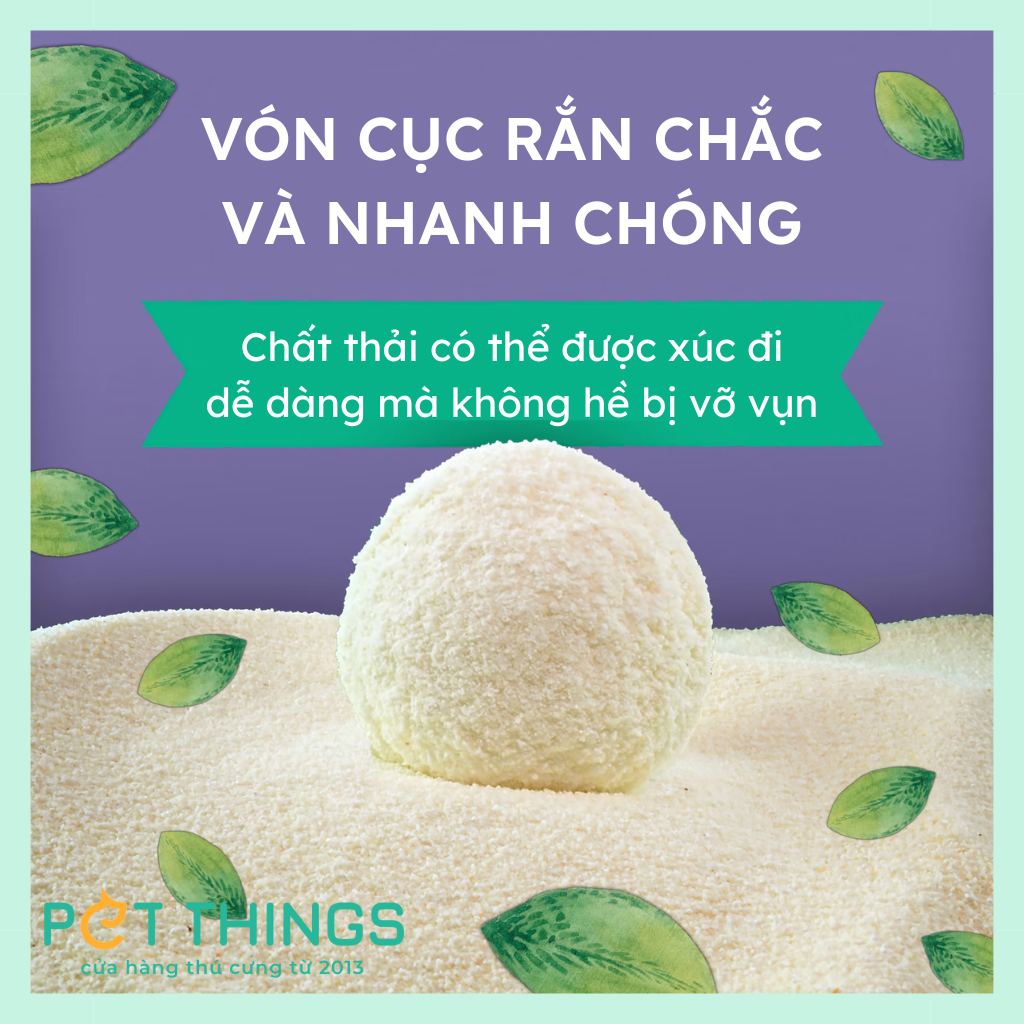 Vón cục chắc và nhanh - sắn trong loại cát mèo này hoàn toàn tự nhiên & giàu tinh bột; Các cụm vón cục không chỉ giữ lại bất kỳ mùi hôi còn sót lại nào, mà nó không giống như các chất độn gốc thực vật thông thường, chúng có thể dễ dàng được vớt ra mà không bị vỡ hoặc vụn. Sau 15 phút, các cục vón có thể được xả xuống bồn cầu một cách an toàn