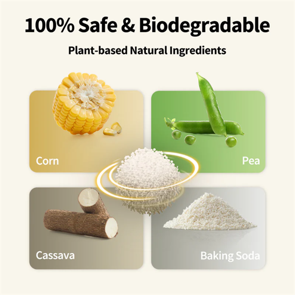 Có khả năng phân hủy sinh học và thân thiện với môi trường. Cát vệ sinh cho mèo này được làm từ các thành phần hoàn toàn tự nhiên — ngô, đậu Hà Lan, sắn và baking soda — đảm bảo an toàn 100% ngay cả khi mèo vô tình ăn phải.