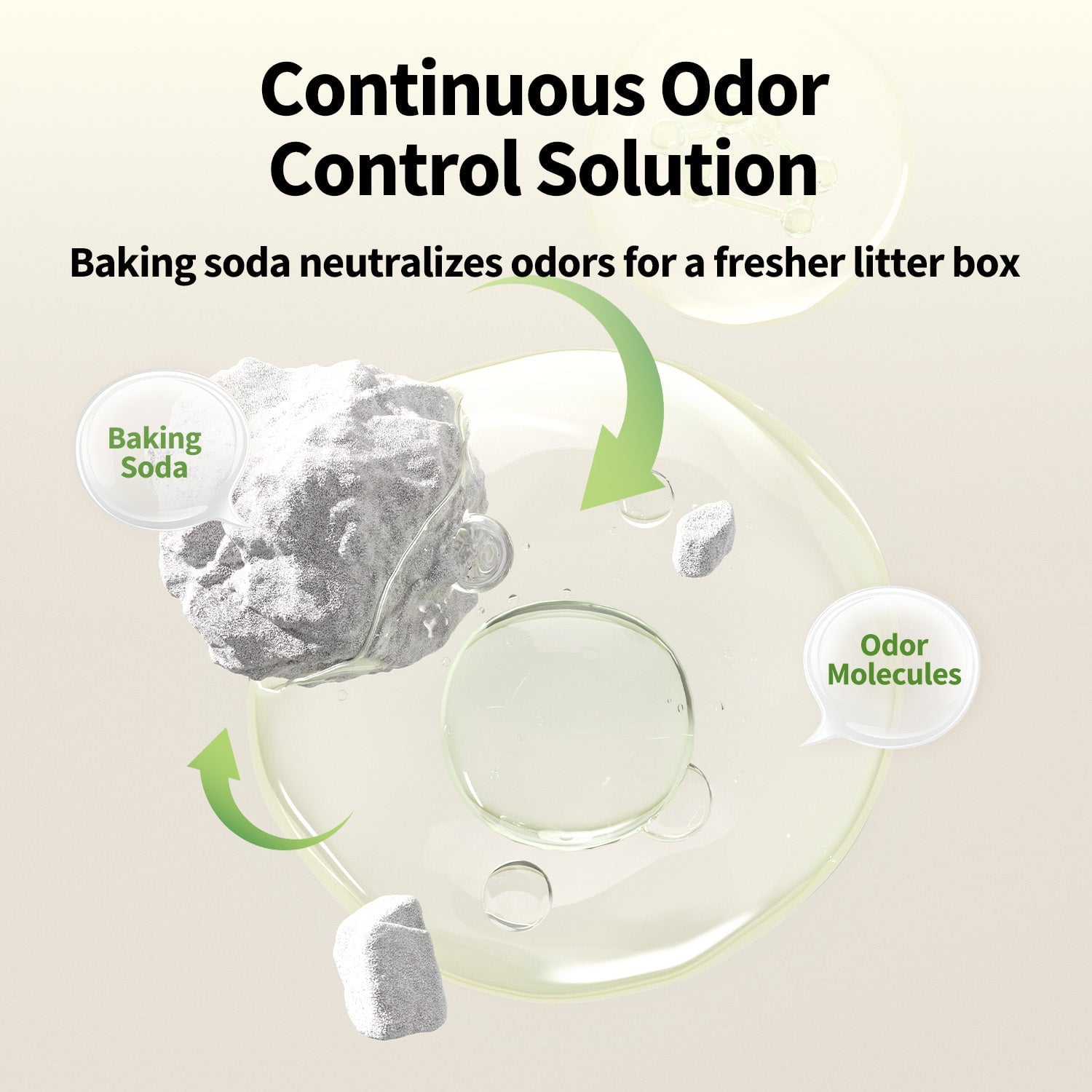 Phân hủy mùi hôi theo 3 bước. Baking soda (NaHCO3) trung hòa các phân tử mùi hôi trong nước tiểu và phân mèo bằng cách tăng độ pH, giúp giảm hiệu quả độ bay hơi của các chất gây mùi.