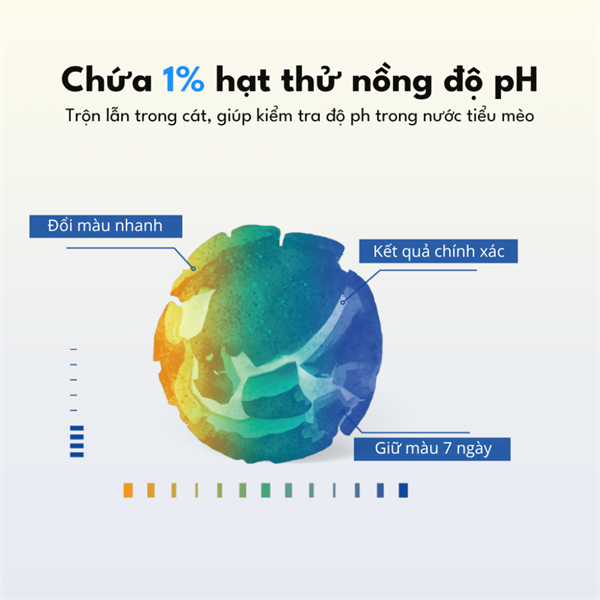 ĐỔI MÀU DỄ NHẬN BIẾT NHÌN THẤY - Các hạt thử nghiệm pH được kích hoạt sẽ đổi màu trong vòng 3 giây khi tiếp xúc với nước tiểu bất thường, báo hiệu các bất thường về nước tiểu, chẳng hạn như bệnh đường tiết niệu dưới ở mèo: chuyển sang MÀU XANH DƯƠNG trong môi trường kiềm và MÀU CAM trong môi trường axit. Lưu ý: Nên liên tục quan sát sự thay đổi màu sắc của các hạt sau khi tiếp xúc với nước tiểu. Nếu kết quả của nhiều lần quan sát đều nhất quán, vui lòng quyết định dựa trên "Mô tả Sự thay đổi Màu sắc" hoặc tham khảo ý kiến bác sĩ thú y trực tiếp.