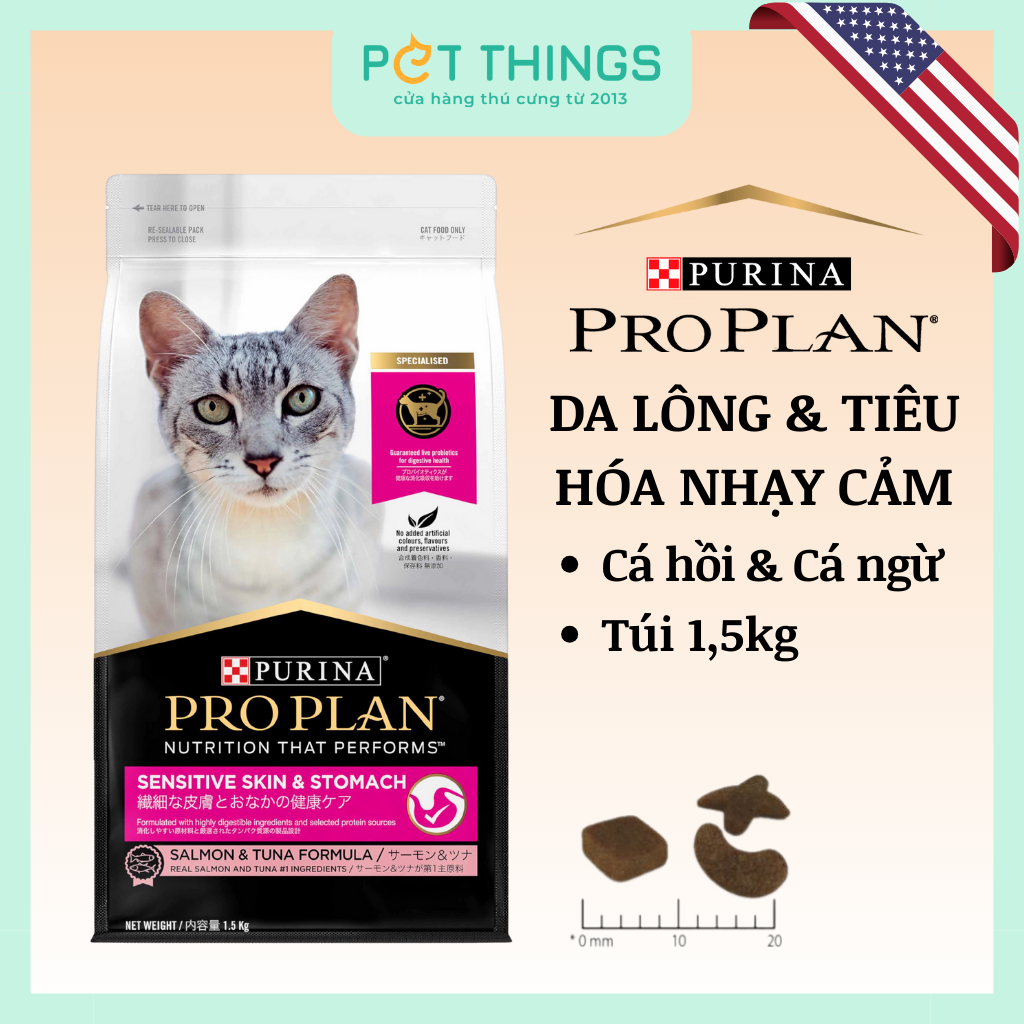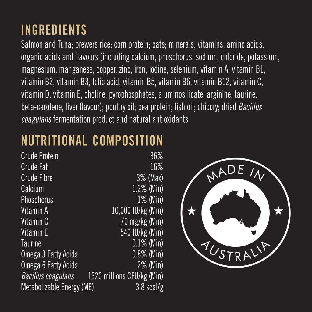 THÀNH PHẦN: Cá hồi và cá ngừ; gạo nấu bia; protein ngô; yến mạch; khoáng chất, vitamin, axit amin, axit hữu cơ và hương vị (bao gồm canxi, phốt pho, natri, clorua, kali, magiê, mangan, đồng, kẽm, sắt, iốt, selen, vitamin A, vitamin B1, vitamin B2, vitamin B3, axit folic, vitamin B5, vitamin B6, vitamin B12, vitamin C, vitamin D, vitamin E, choline, pyrophosphate, aluminosilicate, arginine, taurine, beta-carotene, hương gan); dầu gia cầm; protein đậu; dầu cá; rau diếp xoăn; sản phẩm lên men Bacillus coagulans khô và chất chống oxy hóa tự nhiên.