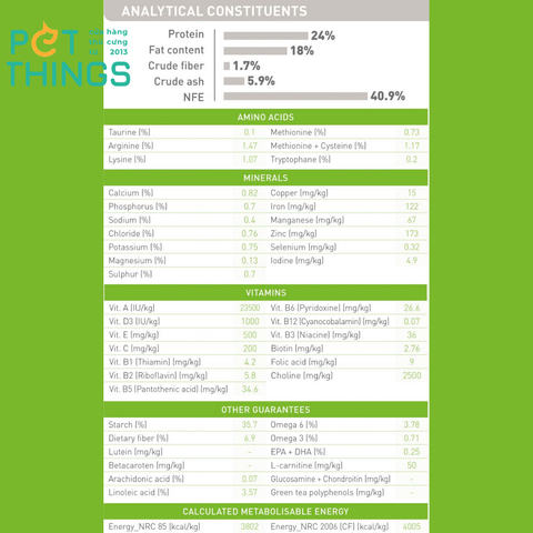 THÀNH PHẦN: gạo, protein gia cầm khử nước, ngô, mỡ động vật, bột ngô, gluten ngô, protein động vật thủy phân, protein thực vật cô lập *, bột rau diếp xoăn, khoáng chất, dầu đậu nành, dầu cá, vỏ và hạt psyllium (1%), men và các bộ phận của chúng, fructo-oligo-sacarit.