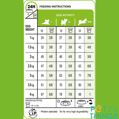 Hạt được phát triển để phù hợp với bộ hàm nhỏ của chó dưới 4 kg. Công thức độc quyền giúp kích thích sự thèm ăn ở những giống chó siêu nhỏ.