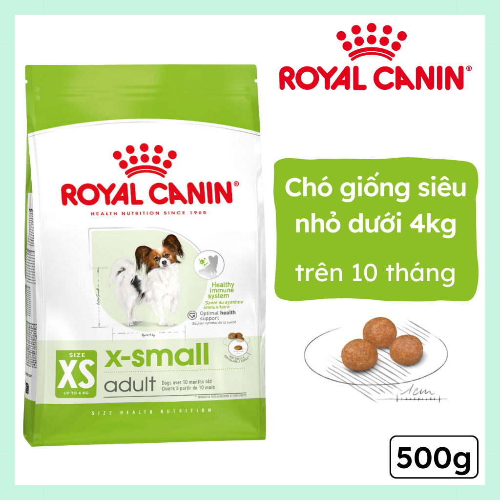 ROYAL CANIN® X-Small Adult được chế tạo đặc biệt để đáp ứng nhu cầu dinh dưỡng của chó giống siêu nhỏ trưởng thành. Công thức này phù hợp cho những giống chó siêu nhỏ trên 10 tháng tuổi có trọng lượng dưới 4kg.