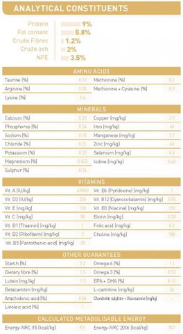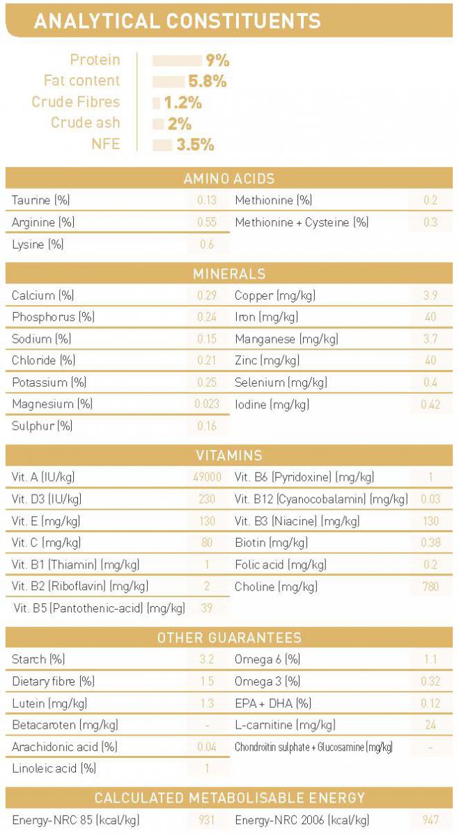 THÀNH PHẦN: Thịt và dẫn xuất từ thịt, cá và dẫn xuất từ cá, dẫn xuất từ thực vật, ngũ cốc, dầu và chất béo, khoáng chất, các loại đường.