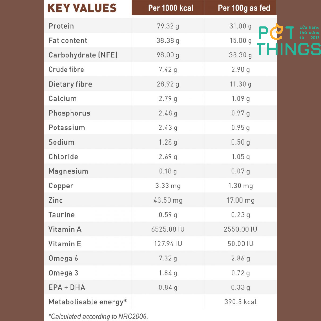Calo: Chế độ ăn kiêng này chứa 3690 kilocalories năng lượng có thể chuyển hóa (ME) trên mỗi kg hoặc 362 kilocalories ME mỗi cốc trên cơ sở được cho ăn (tính toán).
