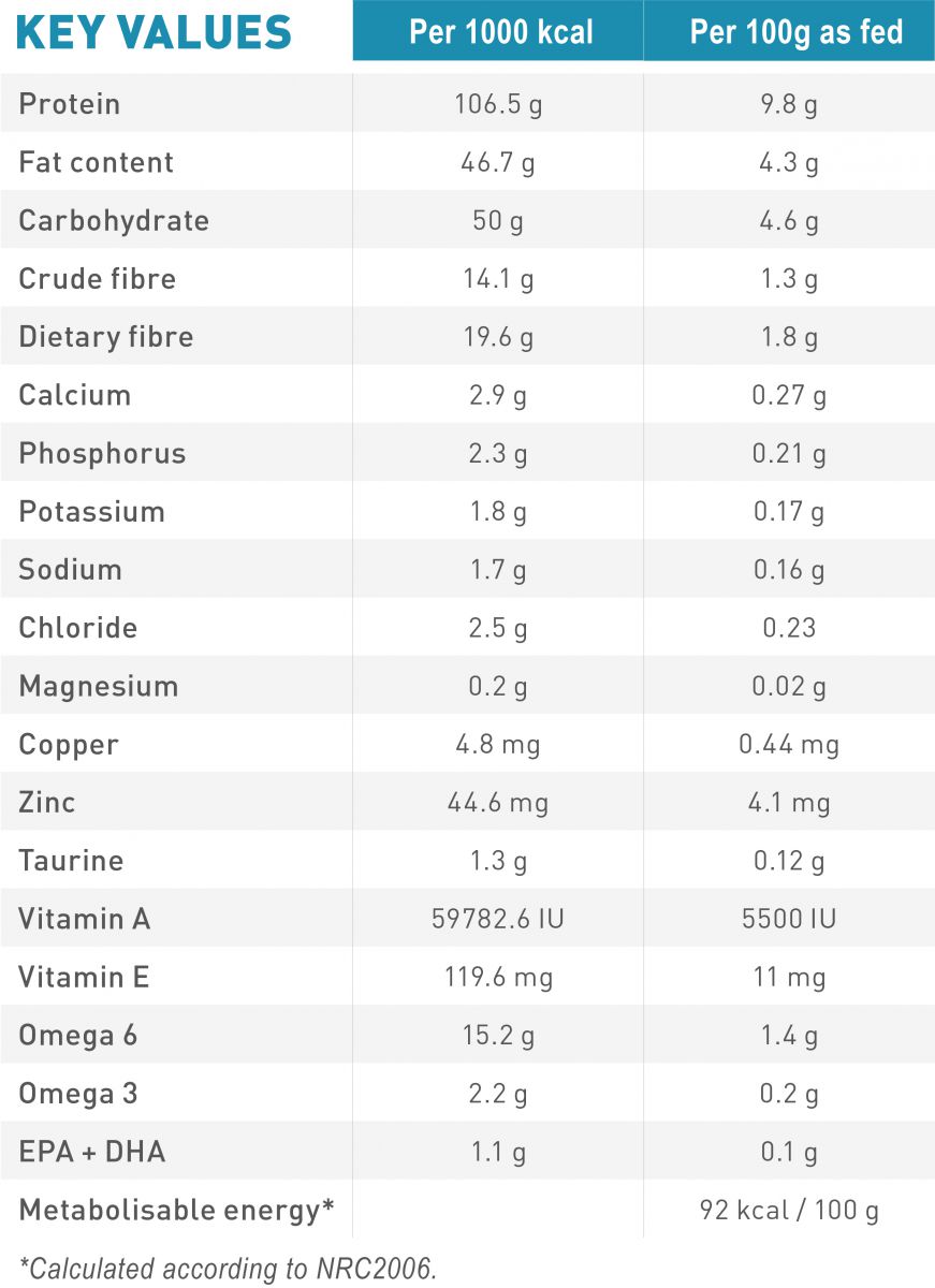 THÀNH PHẦN: Bắp, bột protein gia cầm, gluten lúa mì*, gạo, gluten bắp, protein động vật thủy phân, chất béo động vật, chất xơ thực vật, củ cải đường, khoáng chất, dầu cá, vỏ và hạt psyllium, fructo-oligo-saccarit, dầu đậu nành, dầu lưu ly, chiết xuất cúc vạn thọ (nguồn lutein).