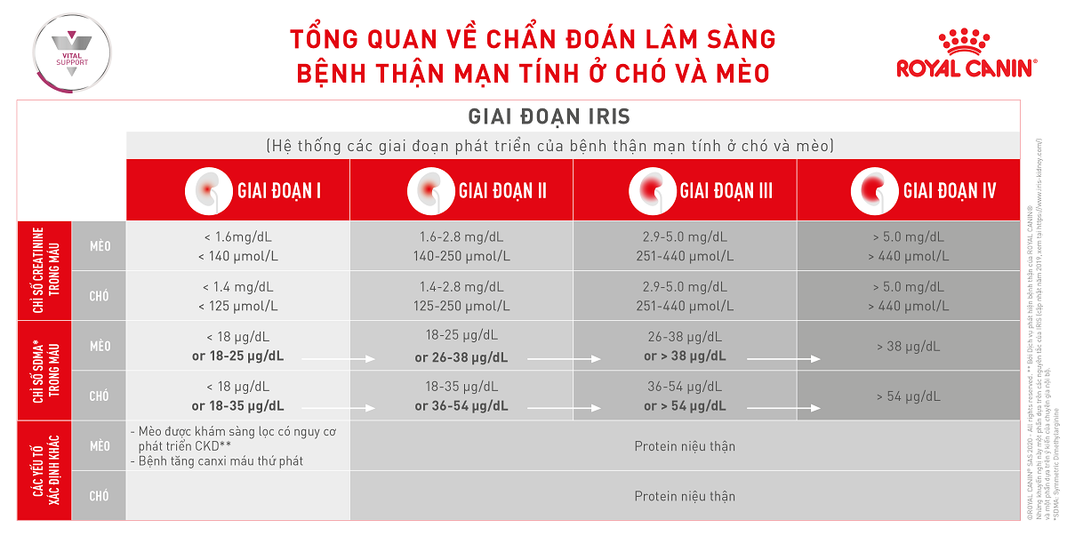 - Dựa vào bảng Hệ thống các giai đoạn phát triển của bệnh thận mạn tính ở Chó và Mèo (IRIS) để đánh giá.