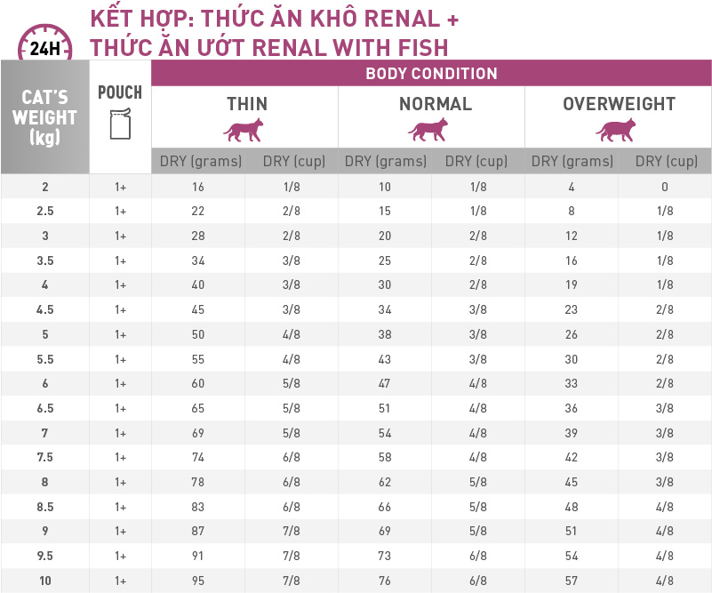 Cho mèo sử dụng chế độ ăn Royal Canin Renal ngay khi nồng độ creatinin* vượt khỏi chỉ số tham chiếu (CKD cuối giai đoạn 2) , trước khi tình hình biến xấu và chuyển thành bệnh mạn tính. Trong trường hợp mèo bỏ ăn có thể chuyển sang chế độ ăn Renal mà không cần bước chuyển đổi (quy tắc đổi thức ăn 7 ngày). Theo dõi sức khỏe thận ở mèo dựa vào bảng chỉ số khoáng chất trong máu (Renal panel): trường hợp lượng canxi trong máu tăng cao hoặc rối loạn chỉ số khoáng chất khác (VD: Hạ nồng độ Kali trong máu).Trong hầu hết các trường hợp, mèo có thể tiếp tục duy trì sử dụng Royal Canin Renal suốt đời.