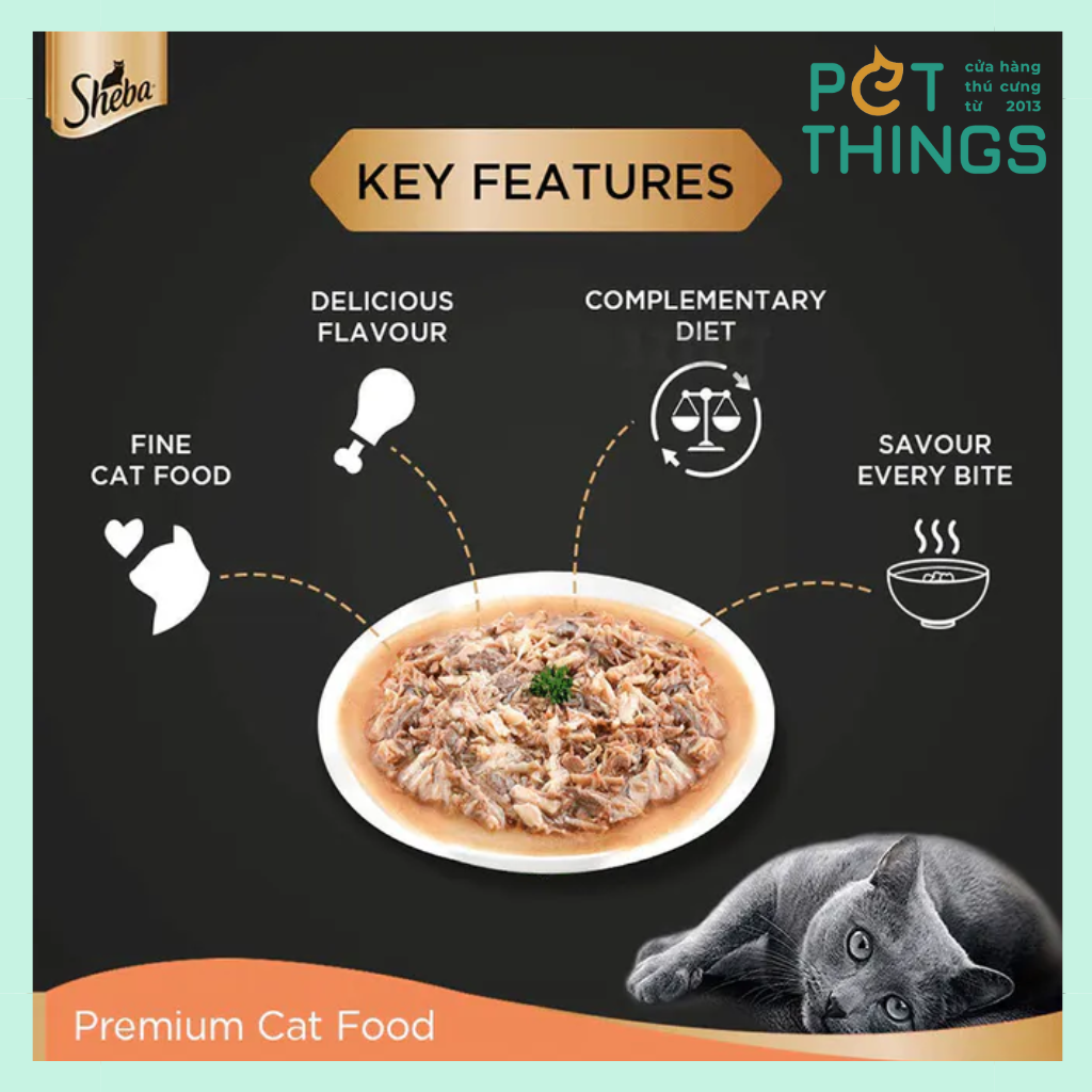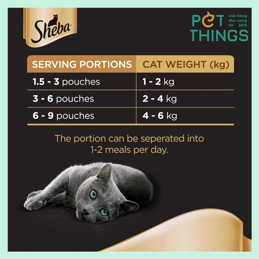Sheba là thức ăn hoàn chỉnh và cân đối có thể được cho ăn như một bữa ăn chính. Có thể điều chỉnh khẩu phần tùy theo hoạt động hàng ngày của mèo và nên chia thành ít nhất 3 bữa mỗi ngày. Nên cho ăn với thức ăn chính khác để đáp ứng đủ nhu cầu dinh dưỡng của mèo