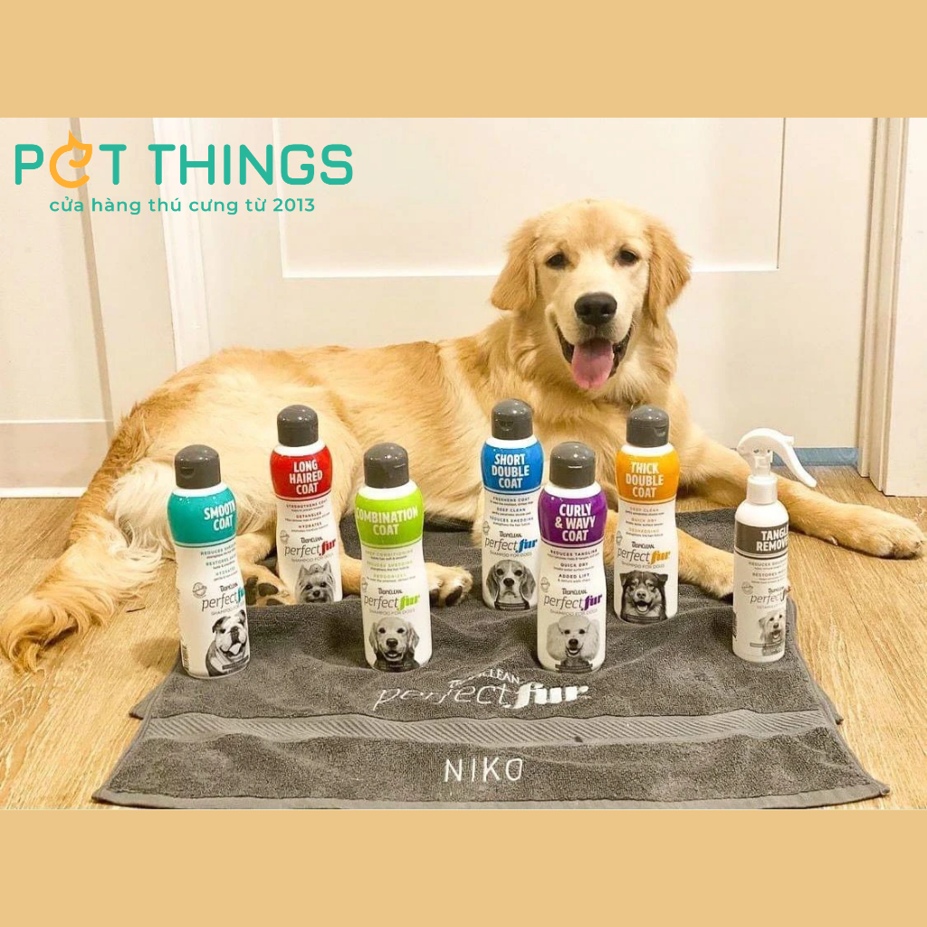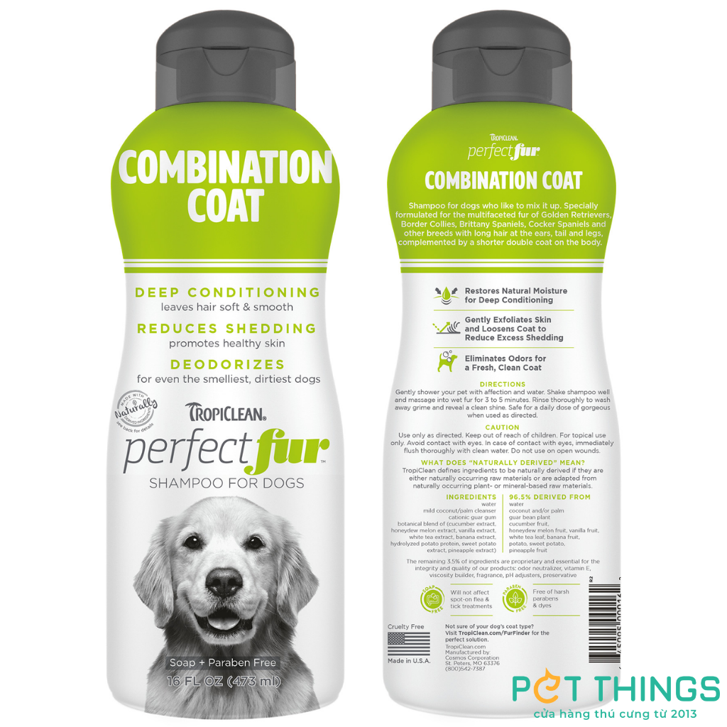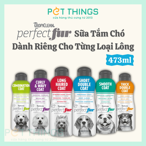 TropiClean PerfectFur Combination Coat, sữa tắm dành cho những chú chó có bộ lông hỗn hợp. Công thức đặc biệt dành cho chó Golden Retrievers, Border Collies, Brittany Spaniels, Cocker Spaniels và các giống chó khác có lông dài ở tai, đuôi và chân, cùng lớp lông ngắn hơn ở các chỗ còn lại.