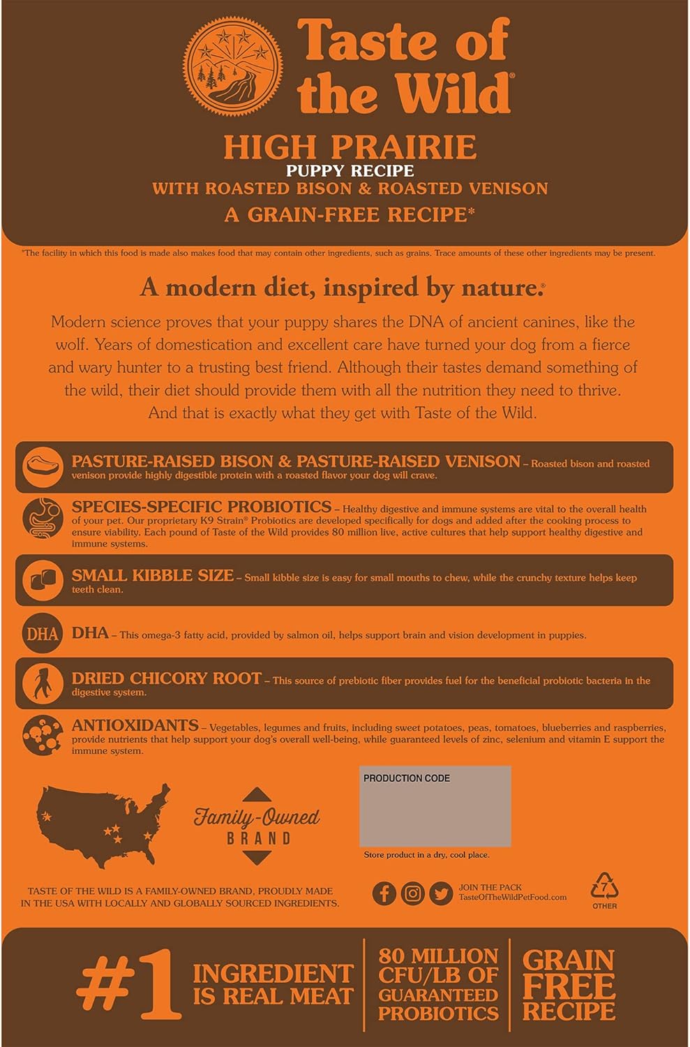 Probiotics dành riêng cho chó - Hệ tiêu hóa và miễn dịch khỏe mạnh là yếu tố quan trọng đối với sức khỏe tổng thể của thú cưng. Chế phẩm sinh học K9 Strain độc quyền của chúng tôi được phát triển đặc biệt cho chó và được thêm vào sau quá trình nấu ăn để đảm bảo khả năng tồn tại. Mỗi pound Taste of the Wild cung cấp 80 triệu vi sinh vật sống, hoạt động giúp hỗ trợ hệ tiêu hóa và miễn dịch khỏe mạnh.
