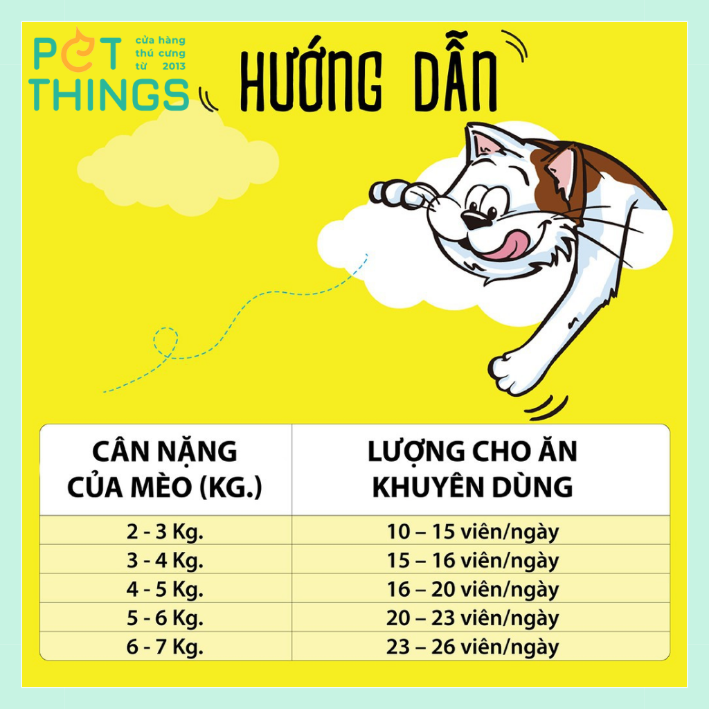 Đối với mèo trưởng thành, cho ăn 10-12 viên/ngày cho mỗi 5kg trọng lượng cơ thể