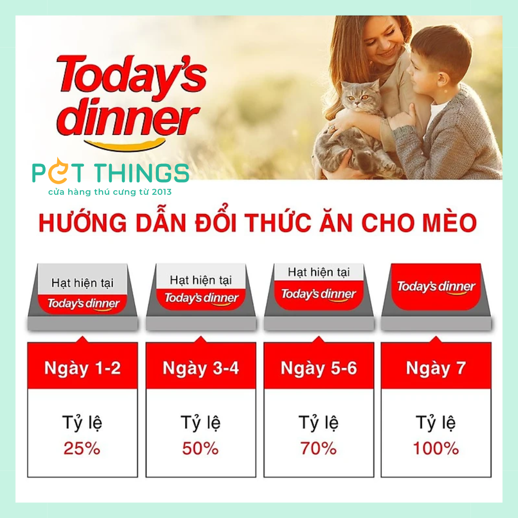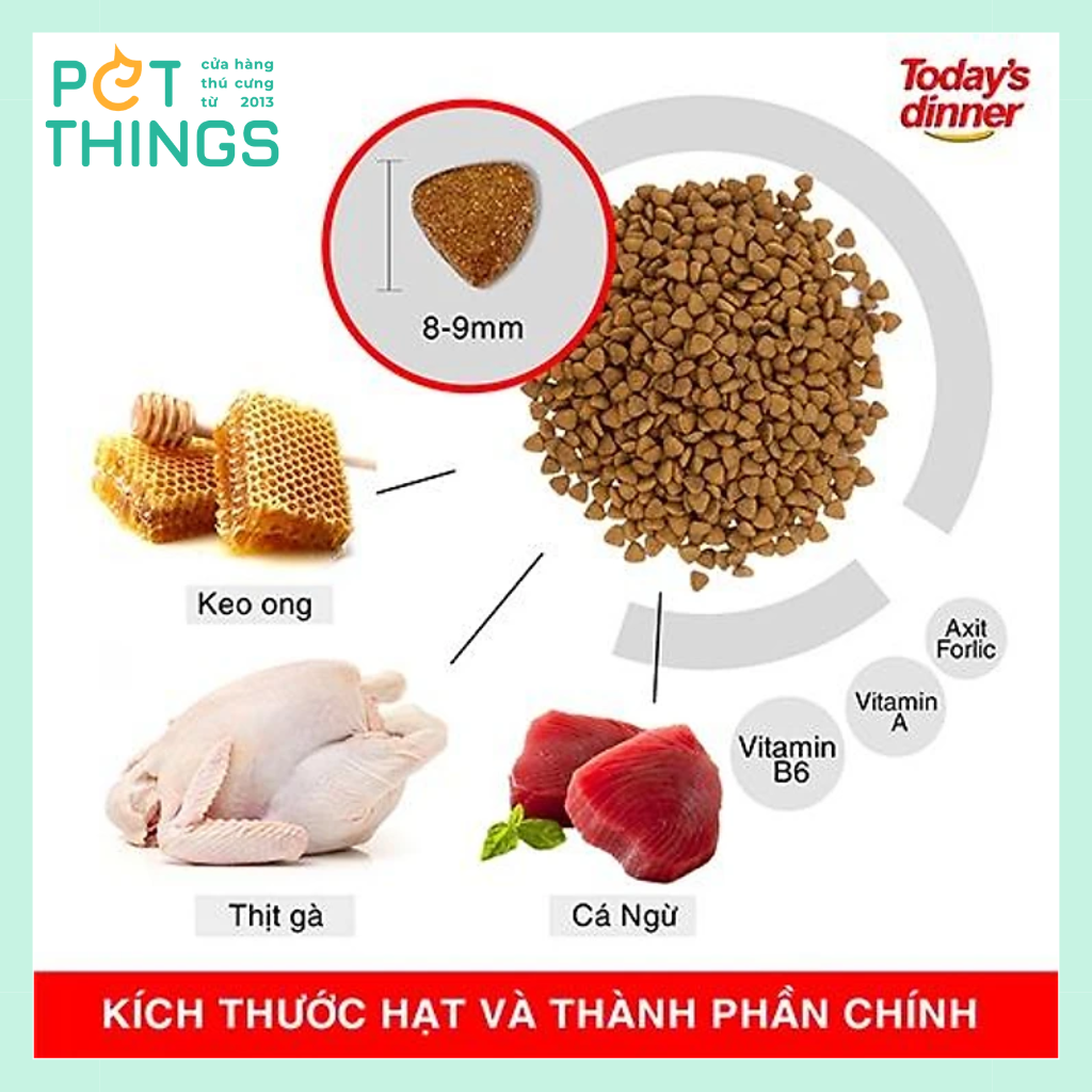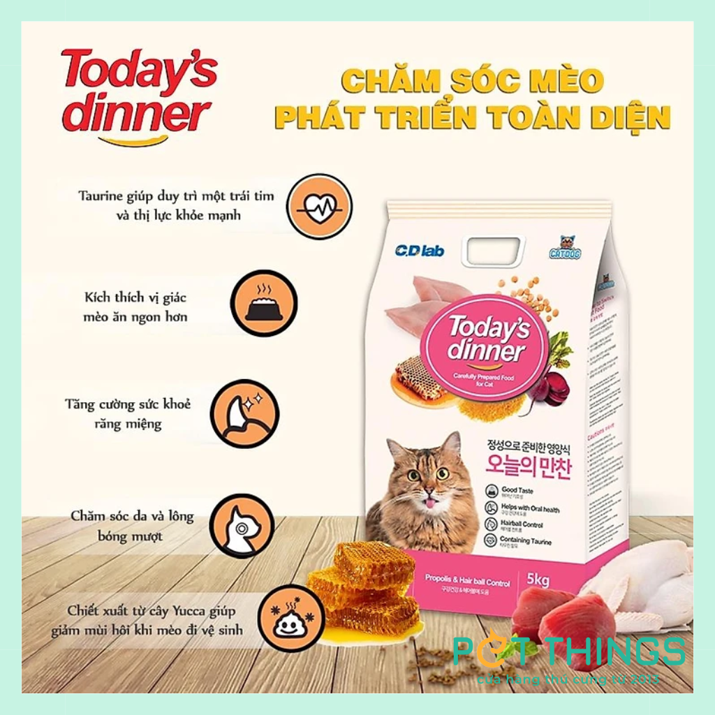Today's Dinner là thức ăn cho mèo mọi lứa tuổi. Công thức đặc biệt với “gia vị rắc hạt” khiến bé mèo nào cũng yêu thích. Đặc biệt tăng cường lượng keo ong rất tốt cho mèo mọi lứa tuổi.