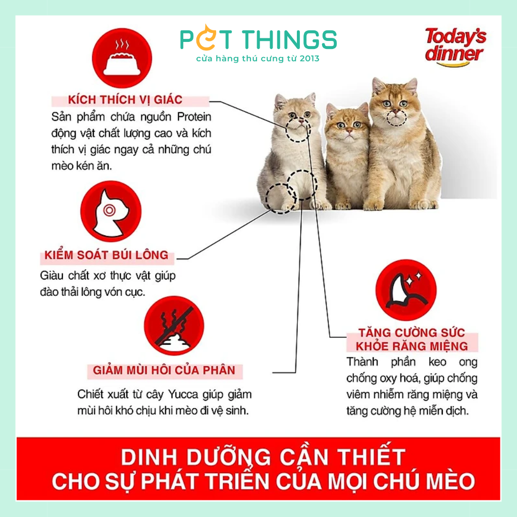 - Kích thích vị giác: Thức ăn cho mèo Todays' dinner chứa nguồn Protein động vật chất lượng cao và đã được thử nghiệm qua vật nuôi, giúp kích thích vị giác ngay cả những chú mèo kén ăn.