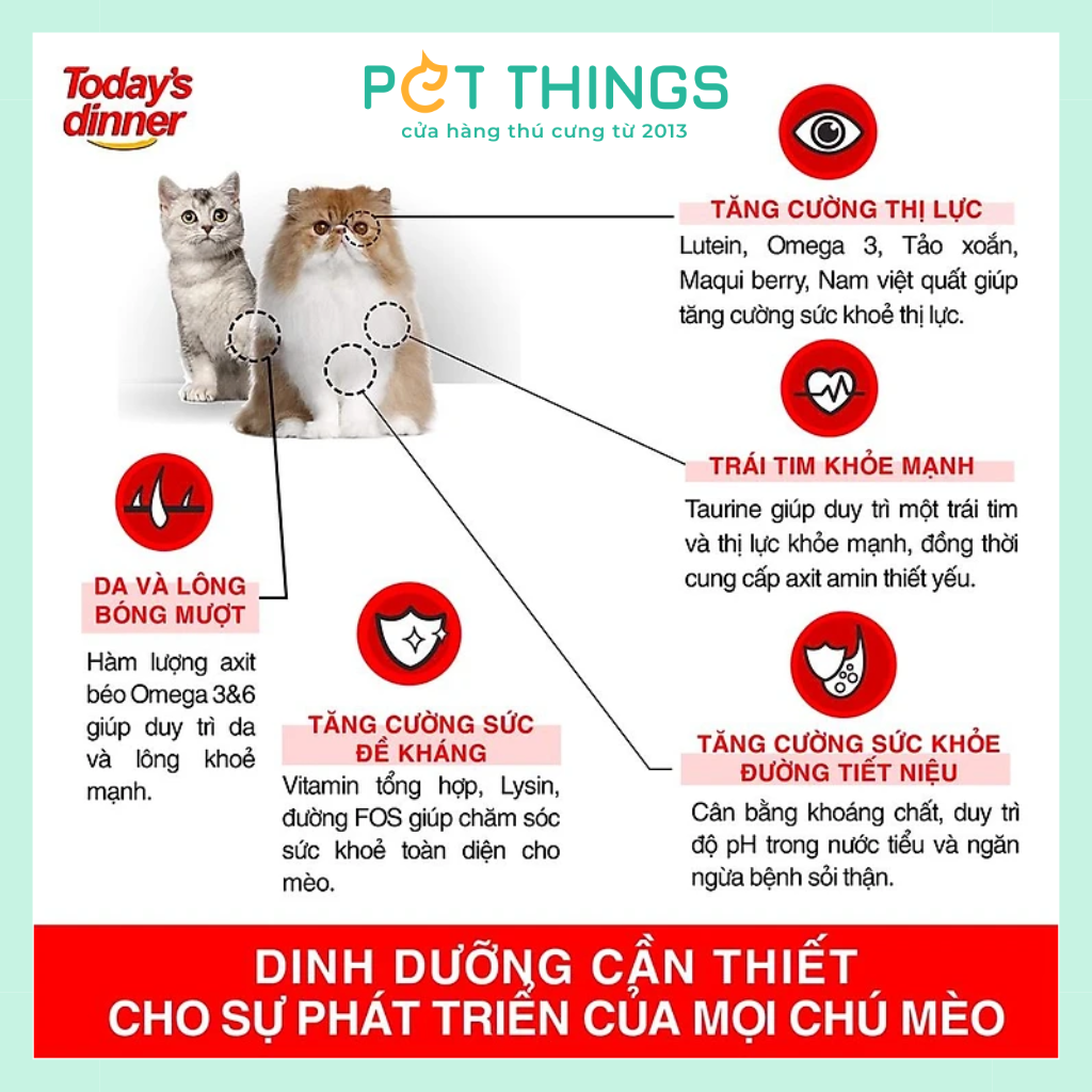 - Tăng cường sức đề kháng: Thức ăn cho mèo Todays' dinner có chứa vitamin tổng hợp, Lysin, đường FOS giúp chăm sóc sức khoẻ toàn diện cho mèo
