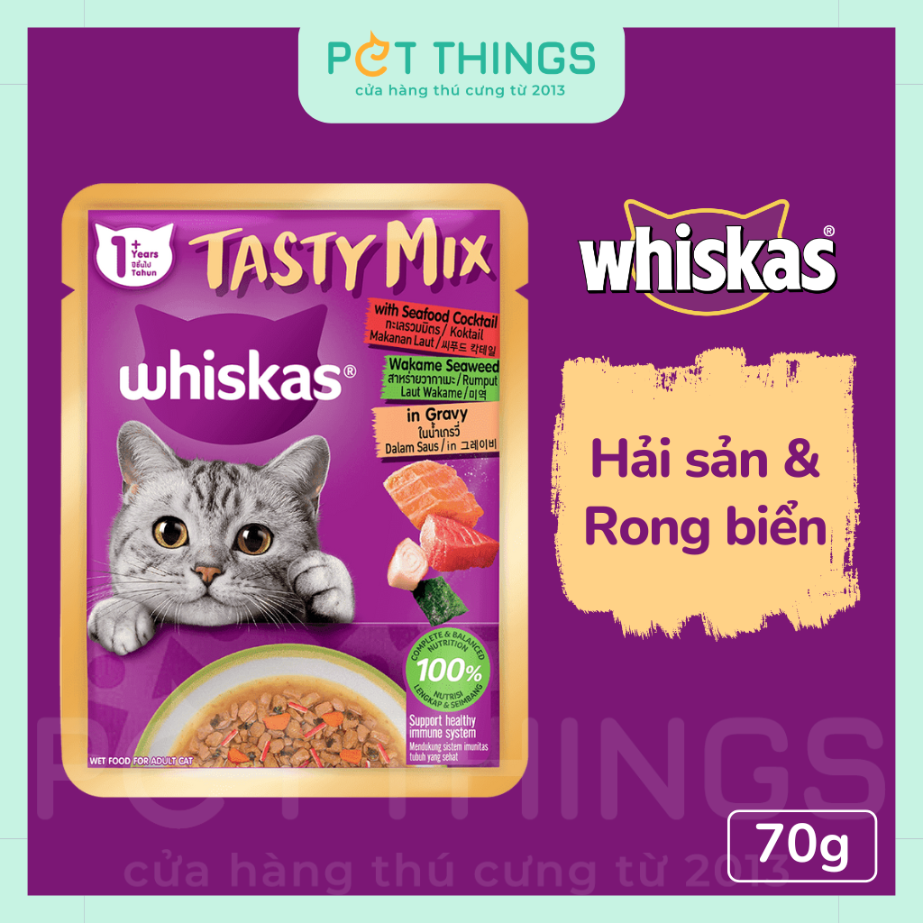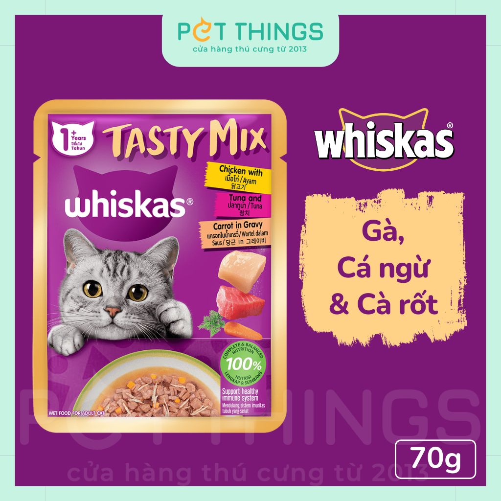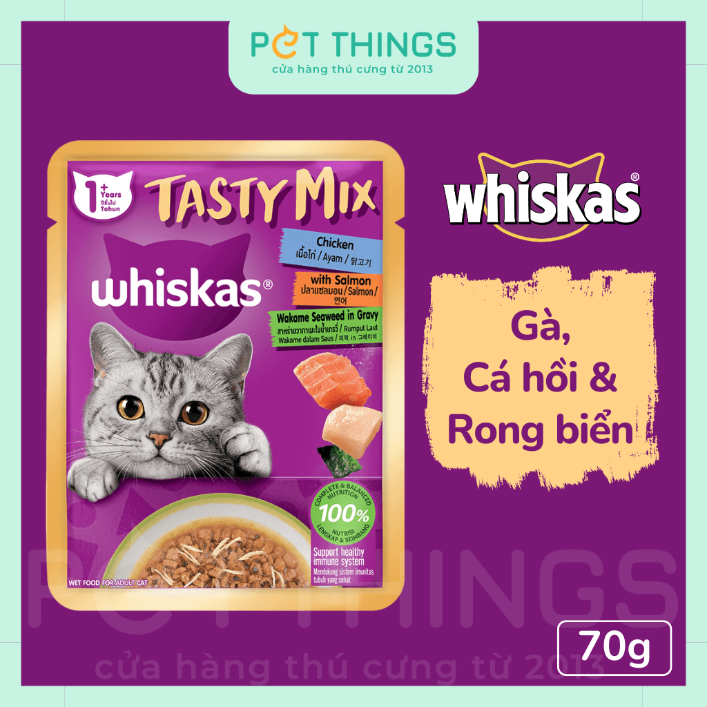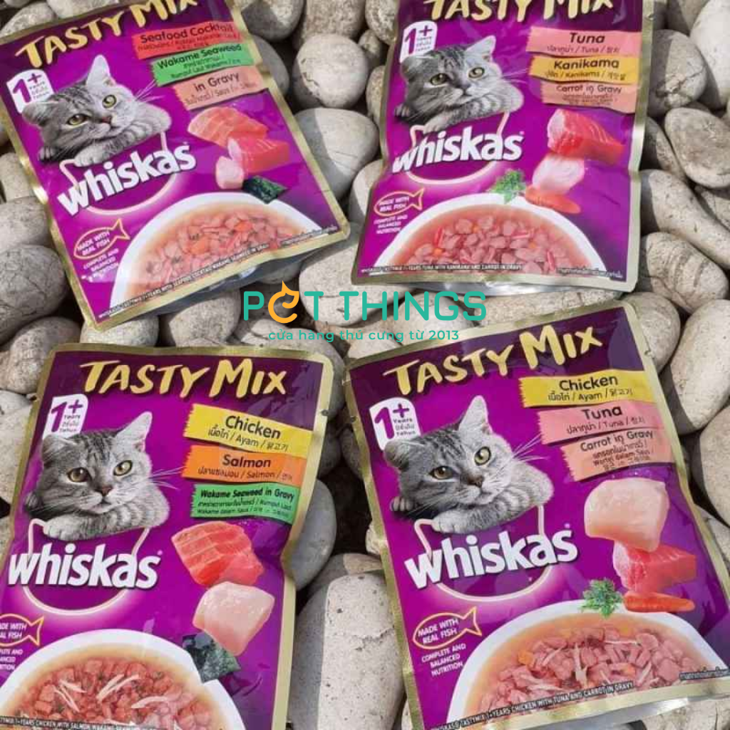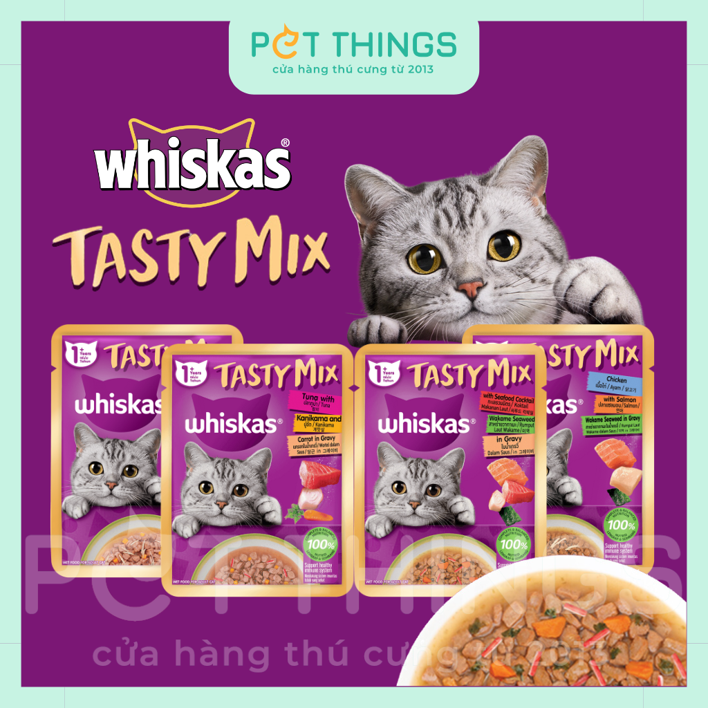 Dòng sản phẩm Whiskas Tasty Mix là pate cao cấp cho mèo trưởng thành, giúp bữa ăn của mèo thêm phần hấp dẫn với đủ mọi hương vị thơm ngon mà mèo yêu thích.